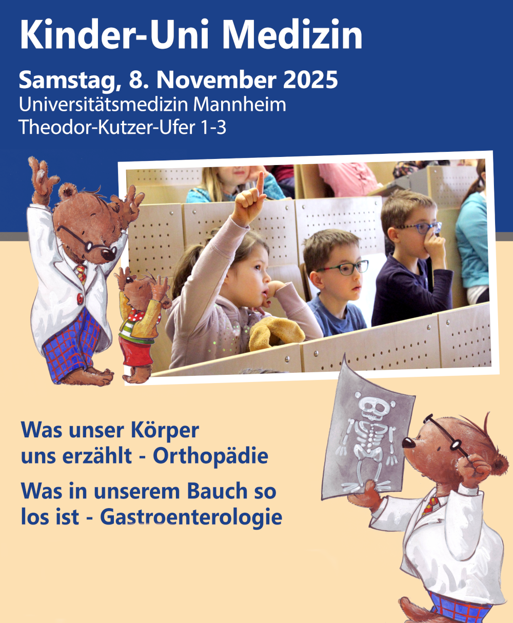 Die Kinder-Uni Medizin öffnet die Türen des Großen Hörsaals der Universitätsmedizin Mannheim (UMM) für Kinder zwischen acht und dreizehn Jahren. Wo sonst Medizinstudenten und Ärzte lernen, erfahren die Kinder in zwei altersgerechten Vorlesungen Interessantes aus Medizin und Forschung.