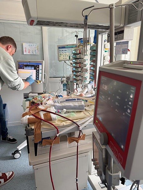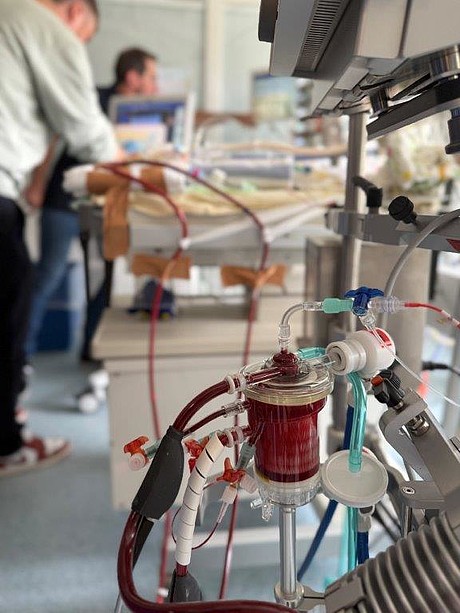 Ein Neugeborenes mit einem schweren Mekoniumaspirationssyndrom (MAS) wurde uns zur ECMO-Therapie (extrakorporale Membranoxygenierung) zugewiesen. MAS entsteht, wenn das Kind während oder kurz vor der Geburt Kindspech (Mekonium) in die Lunge einatmet – das kann zu einer schweren Entzündung, Atemnot und zum Versagen der Lunge führen.