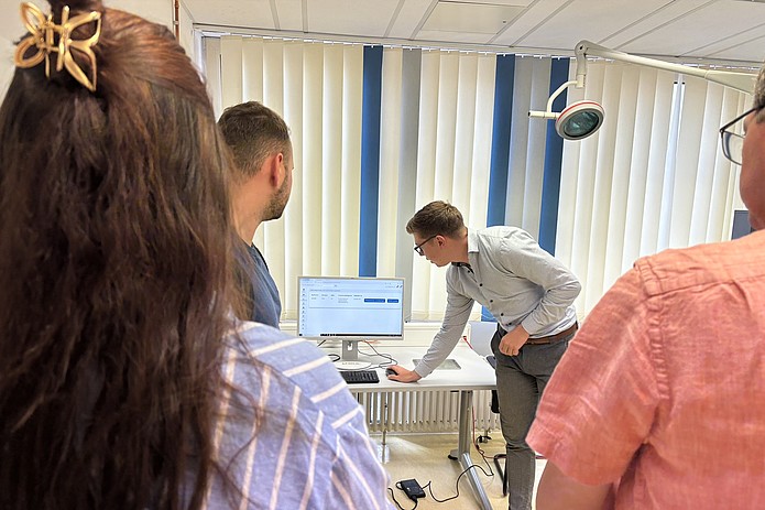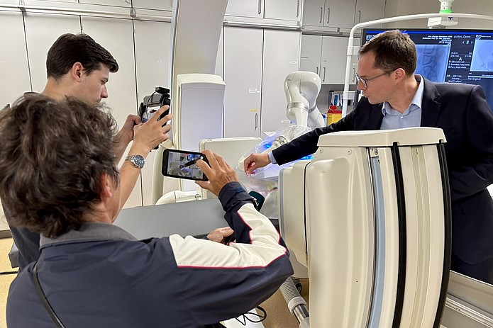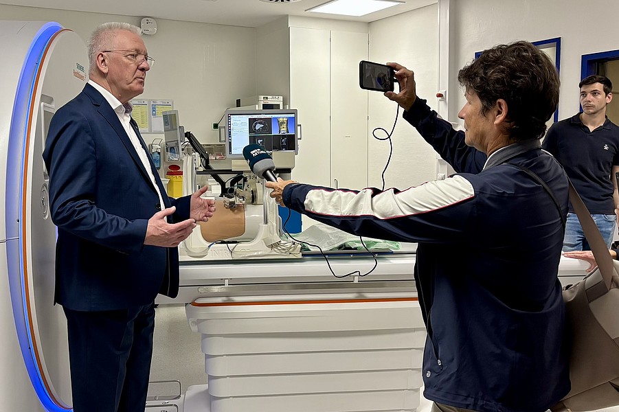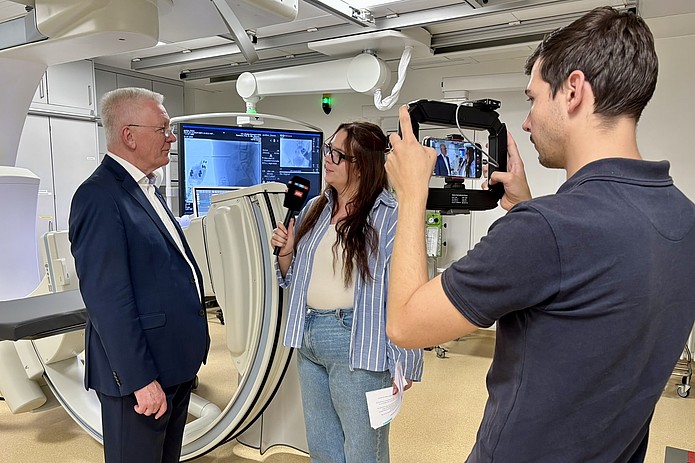 Professor Dr. med.Hans-Jürgen Hennes, Medizinischer Geschäftsführer, und Professor Dr. med. Stefan Schönberg, Direktor der Klinik für Radiologie und Nuklearmedizin, und Professor Dr. med. Patrick Maier, Leiter der M²OLIE-Geschäftsstelle, führten gemeinsam mit den M²OLIE-Expert:innen durch die verschiedenen Stationen und erklärten die hochkomplexen medizinischen und technischen Innovationen verständlich und anschaulich.