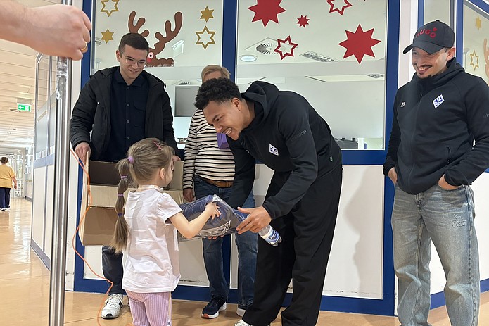 Im Anschluss machten sich Nikolaus und die Waldhof-Spieler auf den Weg zu den Zimmern der Stationen 30-2 und 31-2. Dort besuchten sie die Kinder direkt an ihren Betten und überreichten weitere liebevoll verpackte Überraschungen. Die Begegnungen sorgten für viele strahlende Gesichter und bewegende Momente – sowohl bei den Kindern als auch beim Team.