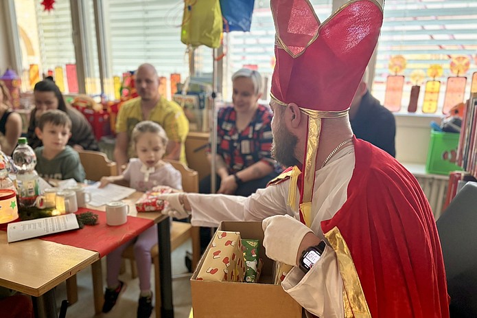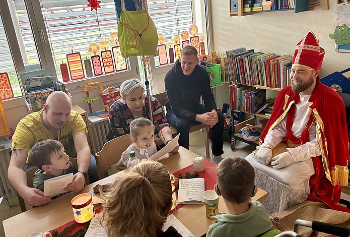 Der Vormittag begann im Spielraum der Station, wo die Kinder gemeinsam Weihnachtslieder sangen. Der Nikolaus las eine weihnachtliche Geschichte vor und verteilte anschließend die Geschenke.