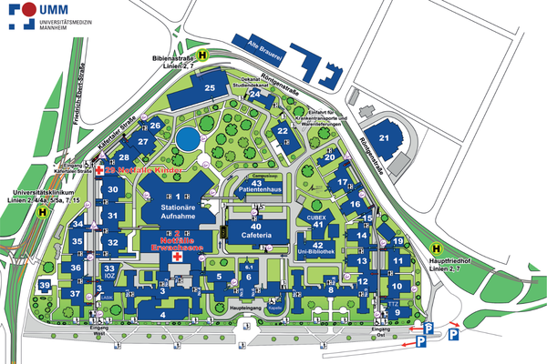 Girişlerin açılış saatleri Roentgen Caddesi: 24 saat açık Batı Girişi: 05:30 - 22:30 Doğu girişi: 05:30 - 22:30 Ana giriş evi 6: 05:30-22:30 Käfertaler Caddesi: 05:30 - 22:30