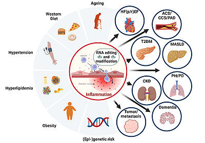 The accompanying figure illustrates how ageing, hypertension, dyslipidemia, obesity, Western diet, and (epi)genetic risk converge on endothelial inflammation and dysregulation of RNA editing and modification. These processes promote cardiometabolic, renal, pulmonary, oncologic, and neurodegenerative diseases. Our mission is to translate these mechanisms into improved diagnostics and therapeutic strategies for patients.