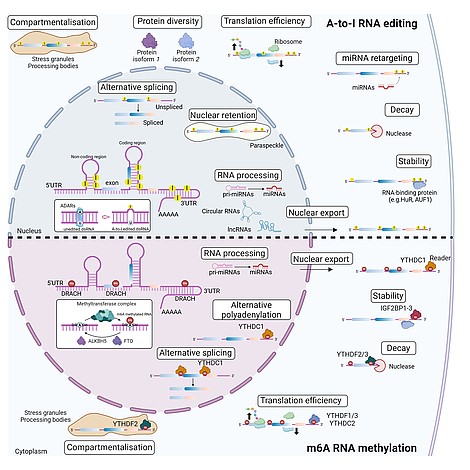 Using state-of-the-art technologies—including long-read RNA sequencing, direct RNA modification mapping, high-resolution imaging, and perturbation-based functional genomics—we identify RNA-driven signatures linked to disease progression, inflammatory activation, and therapeutic response. A particular focus is placed on uncovering causal RNA regulators, such as ADAR-mediated editing events, m⁶A-dependent control of transcript fate, and RNA–protein interactions that orchestrate cellular adaptation to metabolic and inflammatory stress.