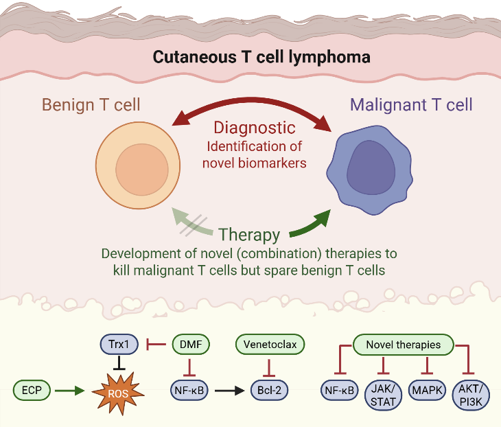 Therapy of CTCL is a great challenge due to short duration of response and limited tolerability of the available treatment options. Therefore, our research is focused on developing novel therapies that specifically target the distinct cell death resistance of CTCL cells and spare benign bystander T cells. Dysregulation of the MAPK pathway in CTCL promotes both proliferation and resistance to cell death, highlighting it as a potential therapeutic target (Kiessling*, Nicolay* et al.: Oncotarget 2017). Furthermore, we identified the NF-κB inhibitor dimethyl fumarate (DMF) as a promising candidate in preclinical studies (Nicolay JP et al.: Blood 2016). In a translational approach, we also performed a clinical phase II multicenter study to confirm the effects also in a clinical context (Nicolay et al.: Blood 2023). At the moment we develop further targeted and immunologic therapies for T cell diseases