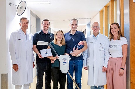 Erstes Bild v.l.n.r.: Prof. Dr. Marc Sütterlin (Direktor der Frauenklinik), Adler-Stürmer Tom Kühnhackl, Julia Keller, David Schneider, Maila (Baby), Prof. Dr. Prof. Dr. med. Benjamin Tuschy (Stellvertretender Klinikdirektor Leitender Oberarzt) und Diana Haase (Leitende Hebamme).