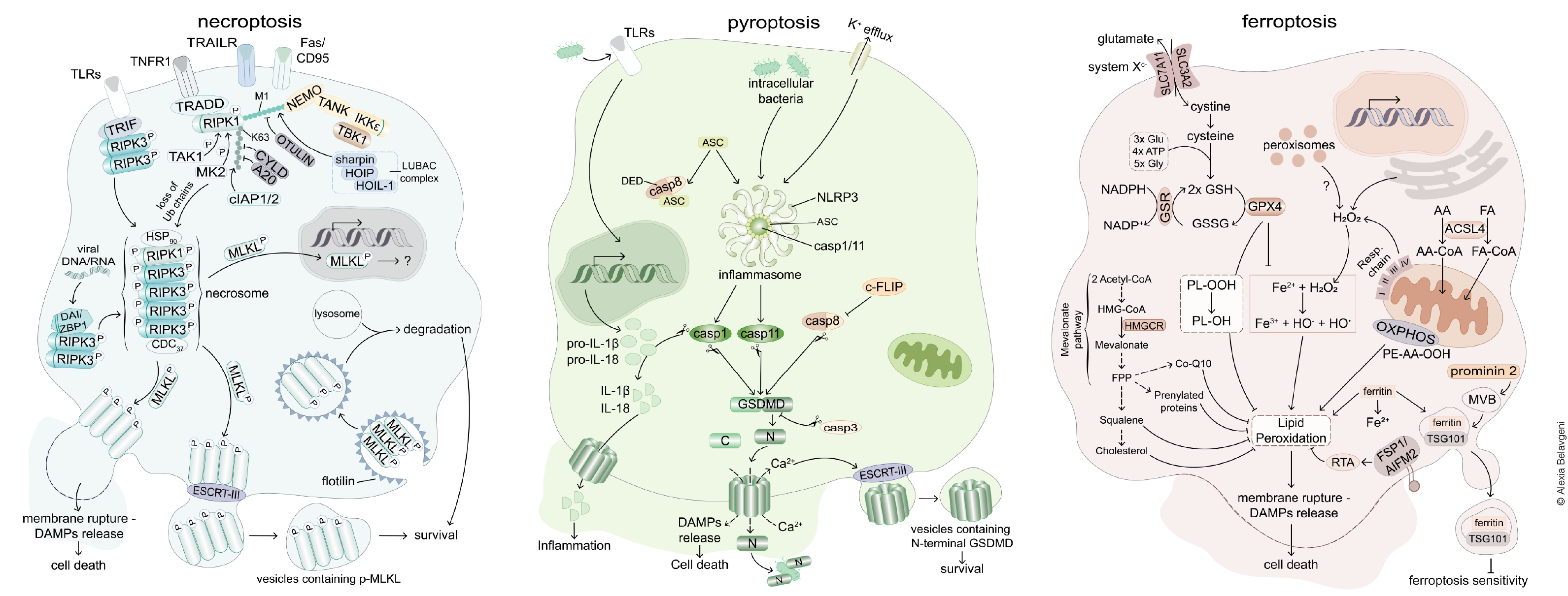 The signaling pathways of regulated necrosis. In general, two systems of regulated cell death may be best differentiated. The caspase-controlled system includes necroptosis and pyroptosis, have been studied in great detail. In contrast, the peroxidation-controlled system of ferroptotic cell death functions entirely independent of the caspase- controlled network. Importantly, both systems independently contribute to acute kidney injury. The necrotic signaling pathways are associated with the release of damage associated molecular patterns (DAMPs) which explain the immunogenicity of necrotic cell death pathways. Adapted from Tonnus et al., Nat Rev Endo 2021